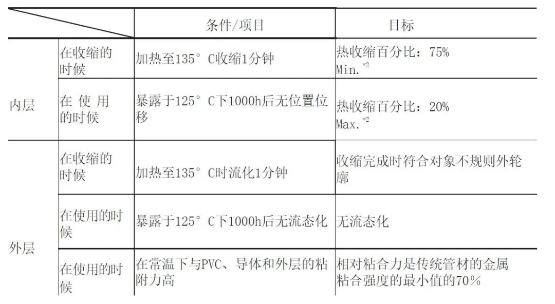 為了防止PVC線在熱收縮過程中發(fā)生熱降解,必須將過程溫度控制在100°C或更低。為了滿足上述要求,我們在自動收縮機(jī)中測量了最大加熱溫度和時間,發(fā)現(xiàn)可以將管道加熱到135°C持續(xù)一分鐘。將管道加熱到此溫度時,其外層必須完全收縮,而內(nèi)層則需要流動并符合被遮蓋對象的不規(guī)則外部輪廓。另一方面,在125°C的使用溫度下,要求管道顯示出適當(dāng)?shù)慕^緣和密封性能,同時又不使管道和粘合劑位移。表2和表3分別顯示了用于新管的材料的開發(fā)目標(biāo)及其目標(biāo)特性。