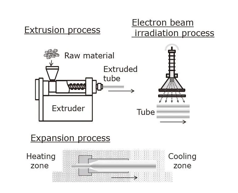 熱縮套管的制造過程如圖2所示。如圖所示,制造過程包括三個步驟:擠壓,電子束*3輻照和膨脹。在擠壓過程中,樹脂被擠壓成管狀。在電子束輻照過程中,管子是交聯(lián)的。在膨脹過程中,通過加熱使交聯(lián)的管子軟化,然后施加內(nèi)部壓力以使管沿徑向膨脹。最后,將管冷卻并固化為熱縮套管。