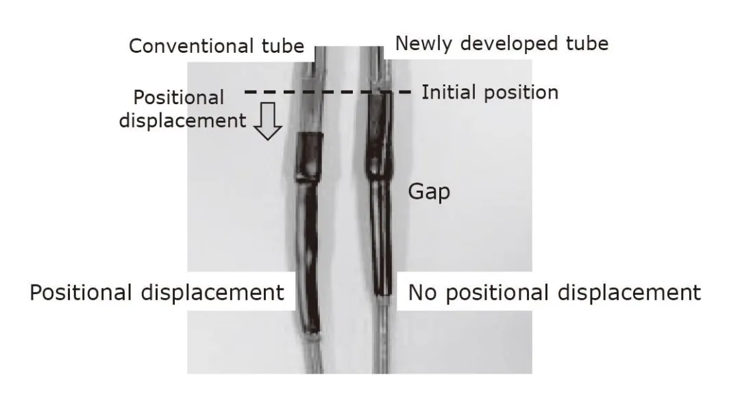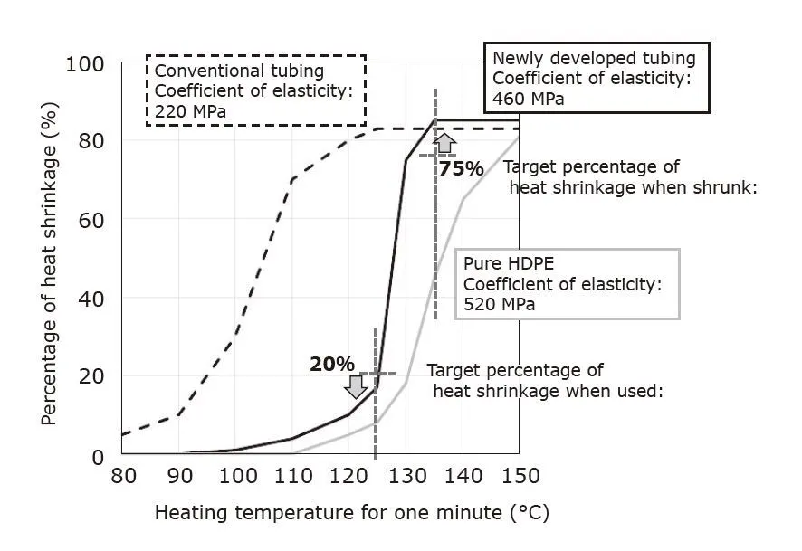 由于高密度聚乙烯(HDPE)*5的彈性系數(shù)高于其他類型的聚乙烯,因此有望提供高機(jī)械強(qiáng)度。然而,發(fā)現(xiàn)HDPE在加熱到135℃(略低于其熔點(diǎn)的溫度)一分鐘時不能充分收縮。相反,其他類型的聚乙烯在加熱到125°C時會收縮,但在125°C的使用溫度下會軟化,從而在徑向方向上產(chǎn)生內(nèi)應(yīng)力并滑出其預(yù)期位置(圖5)。
