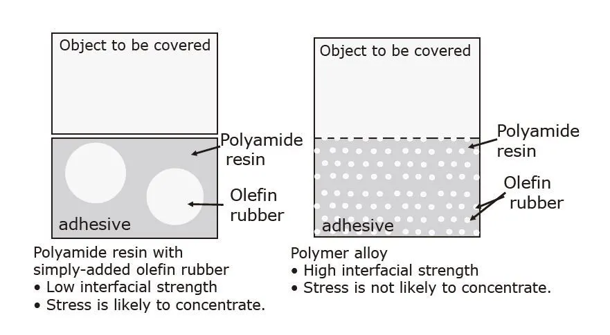 圖9.聚酰胺樹脂與簡單添加的烯烴橡膠和聚合物合金之間的粘合力差異
