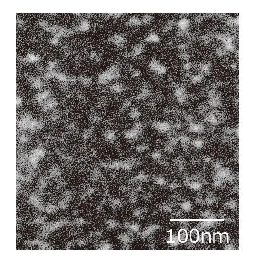 隨后,我們測試了通過向聚酰胺樹脂中添加少量烯烴橡膠制成的聚合物合金(圖9)。在該測試中,該聚合物為聚酰胺樹脂提供了對聚乙烯的高附著力,同時保持了聚酰亞胺樹脂對PVC和金屬的高附著力。相結(jié)構(gòu)的透射電子顯微鏡的結(jié)果(圖10)表明,烯烴橡膠以納米級細(xì)分散。我們得出的結(jié)論是,聚酰胺樹脂和烯烴橡膠之間的界面強(qiáng)度增加以及應(yīng)力集中阻力的增加導(dǎo)致聚合物合金粘合性的增加。
