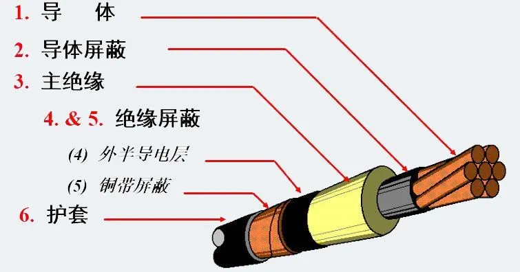 如上圖,電力電纜的基本結構包括:導體、導體屏蔽層、主絕緣、絕緣屏蔽層和外護套等幾個部分。