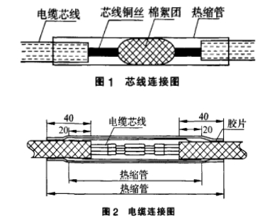專(zhuān)用工具剝出必定長(zhǎng)度的電纜芯線和芯線銅絲,并確保芯線及銅絲不受損害。芯線銅絲顯露長(zhǎng)約1cm.芯線不錫焊.用熱縮套管銜接.兩端芯線之間斷開(kāi)處填塞棉絮并使其嚴(yán)密,見(jiàn)圖1。