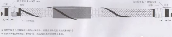 4)外護(hù)套防水處理(第二層):兩端鎧裝打毛,將防水帶拉長(zhǎng)至約1.5倍以半搭疊方式從一端電纜外護(hù)套開始繞包至另一端電纜外護(hù)套上,要求與外護(hù)套搭接100mm。