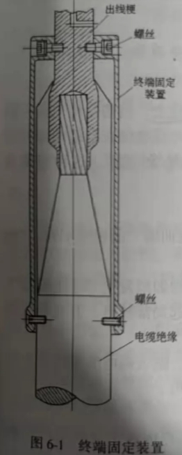2.固定規(guī)劃:為了防止電纜絕緣回縮,在交聯(lián)電纜附件規(guī)劃中選用電纜終端固定設(shè)備和接頭固定設(shè)備的電纜絕緣固定規(guī)劃。1)終端固定設(shè)備,是為防止電纜絕緣回縮,對(duì)終端特別規(guī)劃電纜固定設(shè)備。圖6-1是一種典型的規(guī)劃,采圖6-1終端固定設(shè)備8個(gè)螺絲將金屬筒固定在電纜結(jié)束。