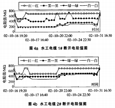 從試驗(yàn)測(cè)得效果來(lái)看15d內(nèi)四芯屏蔽電纜各芯線的斷開(kāi)電阻和芯線之間的絕緣電阻在加壓前后均> 500MΩ四芯水工電纜的絕緣電阻加壓前后也均> 500MΩ見(jiàn)表2。四芯水工電纜各芯線的斷開(kāi)電阻在加壓后有明顯的減小,但均> 180MΩ在持續(xù)加壓過(guò)程中根本處于安穩(wěn),僅隨