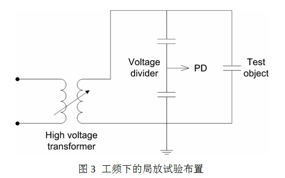 目前普遍以為,50Hz電壓下的局放實驗是運(yùn)用最為普遍的局放檢測方法,最為首要的緣由是運(yùn)轉(zhuǎn)電壓頻率為50Hz,局放檢測成果與實踐最為挨近??墒?,輸電電纜線路長度較長,對實驗設(shè)備的容量請求較高。圖3為工頻電壓下局放檢驗實驗安頓圖。分為變壓器、分壓器以及被試電纜三局部。