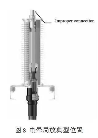 當(dāng)電暈起始點為高壓側(cè)時,在負(fù)半周可以檢測到局放發(fā)作,如圖7所示;當(dāng)電暈發(fā)作在零電位區(qū)域時,局放發(fā)作在正半周。圖8展示了野外終端的電暈易發(fā)作區(qū)域。招致電暈發(fā)作的首要緣由有:不規(guī)范裝置、毛邊、尺度不恰當(dāng)?shù)?。普通來說,這些缺陷都是可以消弭的,而且關(guān)于電纜設(shè)備的平安運(yùn)轉(zhuǎn)不會發(fā)作較大影響。電暈類局放首要發(fā)作在野外終端,普通不會在中心接頭號設(shè)備上呈現(xiàn)。