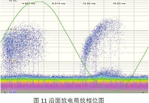 沿面放電首要發(fā)作在電場切線上,放電量較其他局放方式更大。沿面放電的局放量在100 pC至1000 pC,而且總是在過零點之后呈現(xiàn)。由于沿面放電閃絡(luò)間隔更大,對設(shè)備的絕緣功用影響至關(guān)重要。根據(jù)局放放電相位圖(圖11),第三象限下的放電量要大于第一象限。