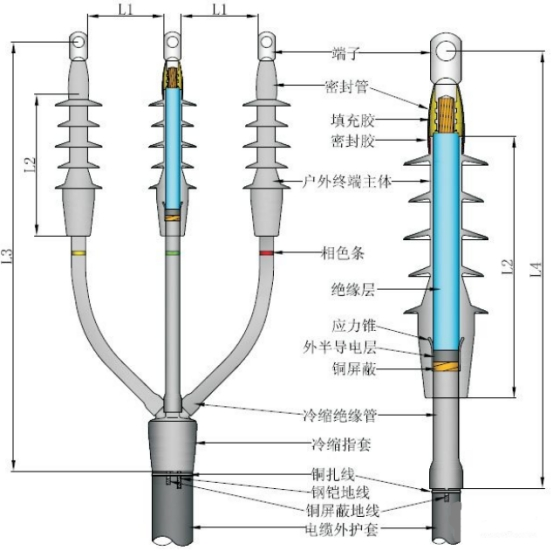 L3可以根據(jù)現(xiàn)場(chǎng)施工環(huán)境適當(dāng)調(diào)整,相應(yīng)的調(diào)整冷縮絕緣管的長(zhǎng)度即可。 |