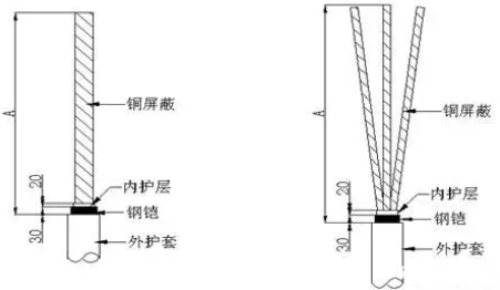 根據(jù)下圖1尺寸剝切電纜外護(hù)層、鎧裝和內(nèi)護(hù)層。
