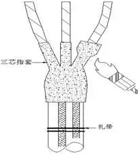 將電纜外護(hù)套端部向下100mm打磨擦凈,在電纜分支處纏繞填充膠填充飽滿,將兩根地線沿電纜拉直平行引出,并使用扎帶臨時固定;套入指套至分支根部,由指套中部向兩端加熱收縮。