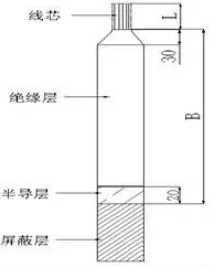 如圖4,尺寸剝除電纜屏蔽層、半導(dǎo)層、以及絕緣層(L=端子孔深+5mm),并且將電纜絕緣末端削成30mm長的錐形。