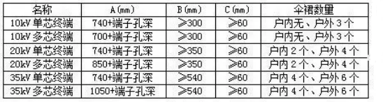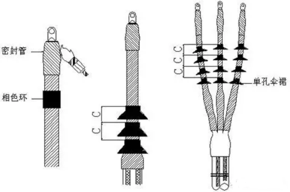 根據(jù)電壓等級及終端種類(戶外/戶內(nèi)),按需求的數(shù)量套入傘裙。第一個單孔傘裙的收縮位置為半導(dǎo)層斷口處,其他傘裙根據(jù)圖示尺寸依次收縮固定。終端安裝完畢。
