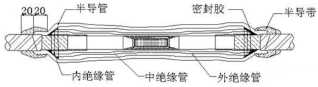 將內(nèi)、外護(hù)套分別套進(jìn)兩端電纜,在電纜護(hù)層被剝除較長的一端每相分別套入一組內(nèi)絕緣管、中絕緣管、外絕緣管和半導(dǎo)管(20kV以下無中壁管,外絕緣管和半導(dǎo)管也可使用復(fù)合管替代),在短端每相套入一段銅屏蔽網(wǎng)(以纏繞的方式恢復(fù)金屬屏蔽層則不需套入)。按原定相序?qū)⒕€芯插入連接管并進(jìn)行壓接,去除連接管表面的毛刺、棱角,并將廢屑清理干凈。先用半導(dǎo)帶纏繞在連接管表面,使其和兩端的內(nèi)半導(dǎo)層相連,再將填充膠(20kV以上纏繞J-30絕緣自粘帶)纏繞與半導(dǎo)帶外及絕緣錐體部位,厚度為高出電纜本體絕緣外徑1-2mm,兩端搭接電纜本體絕緣5mm,并與其平滑過渡。