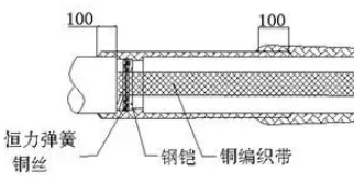 用砂布清除鎧裝層及銅屏蔽的防腐層,露出金屬光澤;將地線使用恒力彈簧固定于鎧裝或銅屏蔽上(也可將地線使用銅絲綁扎與固定位置,再用中性焊劑和焊藥在綁扎位置滿焊,焊接后需清除毛刺)。如銅屏蔽為銅絲屏蔽則將銅絲反折做地線使用。此處兩地線不可短接,鎧裝處收縮一熱縮環(huán)或纏繞絕緣自粘膠帶。