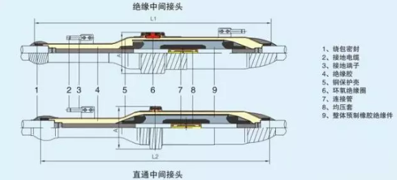 整體預(yù)支中間接頭分絕緣接頭和直通接頭。殼體采用高強度銅材制造,殼內(nèi)澆注EICR-8016高性能的防水絕緣密封雙組份膠。最外層可配玻璃鋼外保護盒,內(nèi)澆注CL-8010高性能的防水絕緣密封雙組份膠。具有較好的機械保護和良好的密封性能,產(chǎn)品結(jié)構(gòu)緊湊合理、體積小,抗老化、防腐蝕;運行后無滲漏,防爆性能好,不會因事故形成碎片危及人身、設(shè)備的安全。各項技術(shù)性能穩(wěn)定可靠,安裝方便。