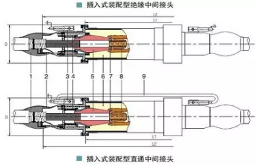 高壓插入式裝配型中間接頭分插入式裝配型絕緣或直通中間接頭。其接頭主體主絕緣為高性能絕緣樹脂,采用先進的真空澆注成型工藝與金屬保護殼成型為一個整體,摒棄了以往采用絕緣油或氣體作為主絕緣的結(jié)構(gòu),消除了由泄漏帶來的問題。該接頭可在一端先裝塞止頭成為一臨時終端,需連接電纜時,拆下塞止頭插入連接電纜即可。連接金具設(shè)計為插拔式免模壓結(jié)構(gòu),安裝極其方便。