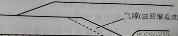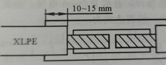 對(duì)于高壓XLPE絕緣電纜的附件安裝,亦有必要認(rèn)真考慮回縮問(wèn)題,一般在加熱校直的同時(shí)消除XLPE內(nèi)的應(yīng)力,由于高壓纜接頭中不可能制造出屏蔽結(jié)構(gòu),接頭中任何一點(diǎn)的XLPE回縮都會(huì)給接頭帶來(lái)致命的缺點(diǎn),即氣隙(見(jiàn)圖3),該氣隙內(nèi)發(fā)生局部放電,將會(huì)導(dǎo)致接頭擊穿。