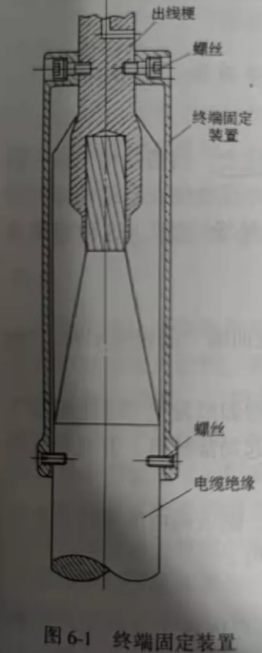 2.固定規(guī)劃:為了防止電纜絕緣回縮,在交聯(lián)電纜附件規(guī)劃中選用電纜終端固定裝置和接頭固定裝置的電纜絕緣固定規(guī)劃。1)終端固定裝置,是為防止電纜絕緣回縮,對(duì)終端特別規(guī)劃電纜固定裝置。圖6-1是一種典型的規(guī)劃,采圖6-1終端固定裝置8個(gè)螺絲將金屬筒固定在電纜結(jié)尾。