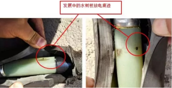 2)故障中心接頭杰出相絕緣外表的水樹枝