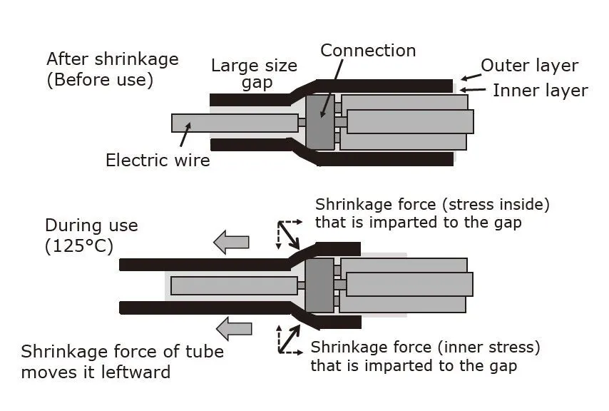 由于高密度聚乙烯(HDPE)*5的彈性系數(shù)高于其他類型的聚乙烯,因此有望提供高機(jī)械強(qiáng)度。然而,發(fā)現(xiàn)HDPE在加熱到135℃(略低于其熔點(diǎn)的溫度)一分鐘時(shí)不能充分收縮。相反,其他類型的聚乙烯在加熱到125°C時(shí)會收縮,但在125°C的使用溫度下會軟化,從而在徑向方向上產(chǎn)生內(nèi)應(yīng)力并滑出其預(yù)期位置(圖5)。
